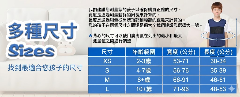 許多有感官處理需求的孩子,在面對喧鬧環境或需要專注時容易感到焦慮。這款背心透過**「深層壓力刺激」**,提供像擁抱般的安定感,是治療師、老師與家長們的居家必備良伴。