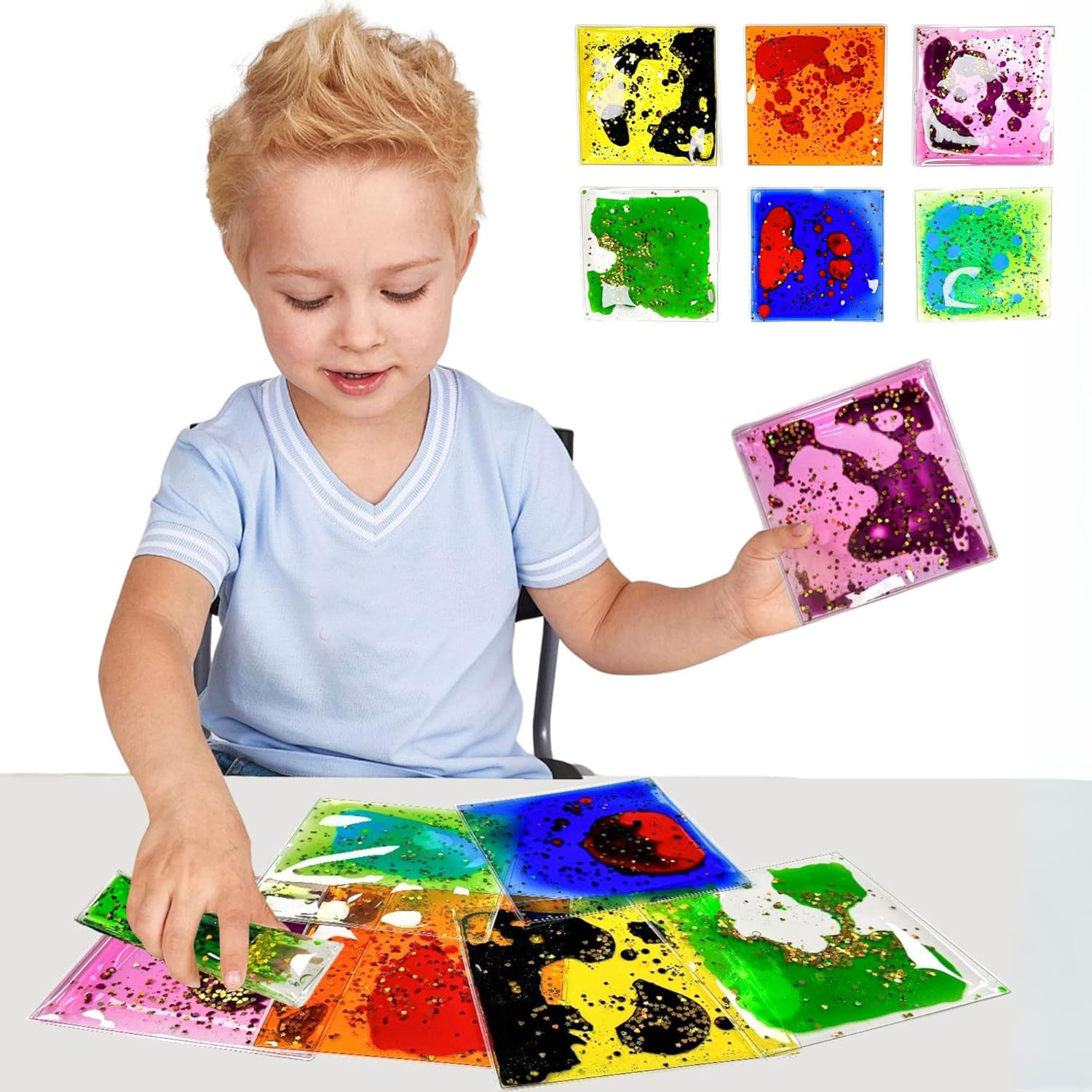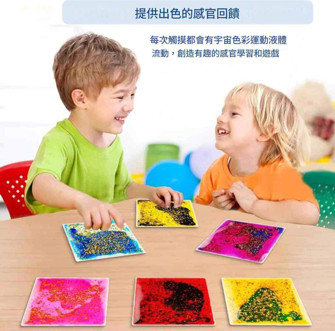 ✅ 感官啟蒙好幫手:柔軟液體方墊,內含亮麗色彩與閃粉,按壓時液體流動,吸引孩子視覺與觸覺,讓玩樂成為感統訓練的一部分!