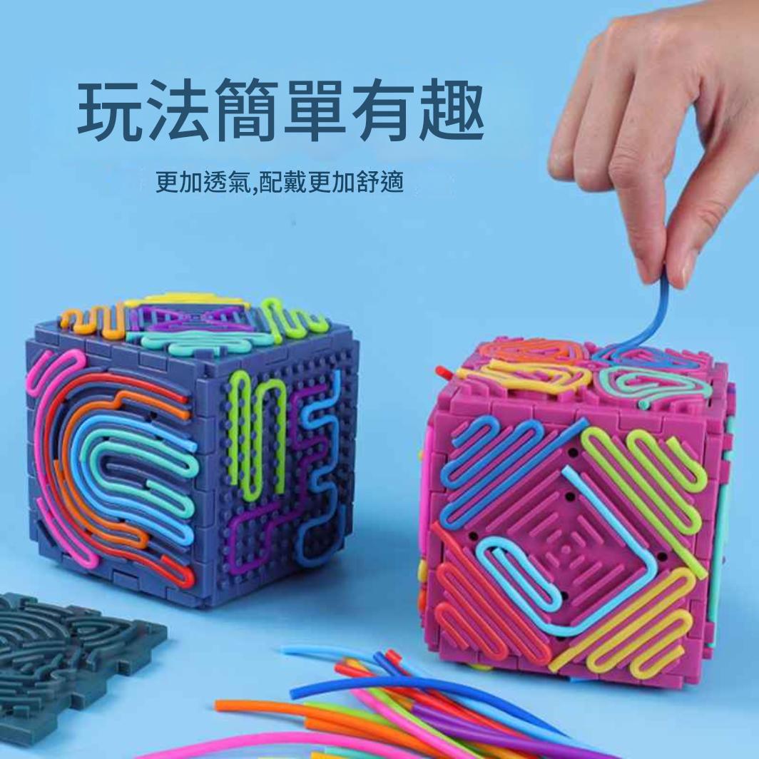 每一面都有不同觸感與路徑設計,孩子可自由穿線、拆裝與拼接,訓練手眼協調與專注力。