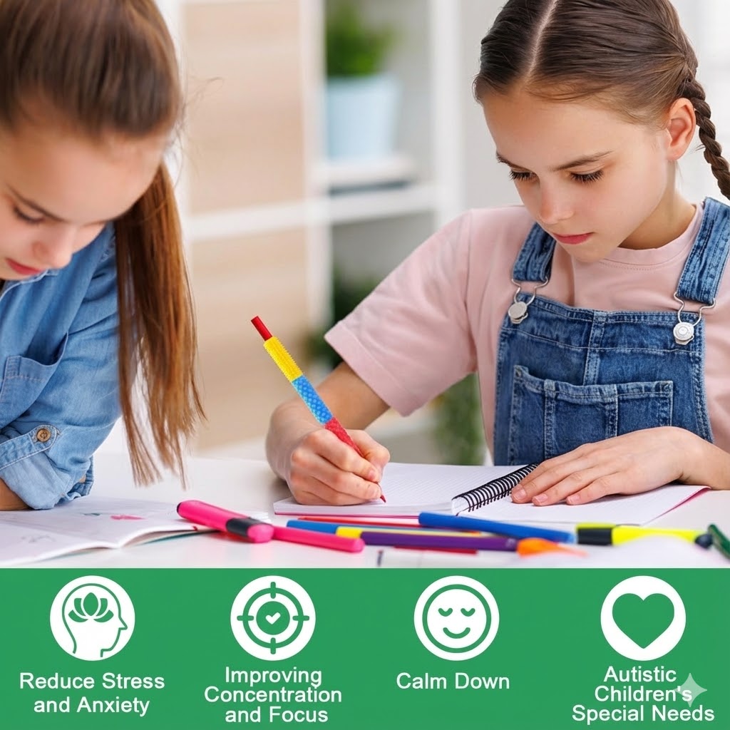 每一款筆套都有獨特的立體紋路(顆粒、波浪、線條等),透過指尖的摩擦與觸摸,提供大腦穩定的感官輸入,有效幫助 ADHD (注意力不足過動症)、自閉症 或 焦慮症 的使用者冷靜下來,提升專注力。