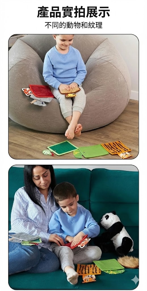 這款【動物感統觸覺安撫墊】結合多種動物造型與不同表面紋理,透過「摸、壓、滑、感受」的過程,幫助使用者進行觸覺刺激與情緒安撫,是日常放鬆與專注訓練的好幫手。