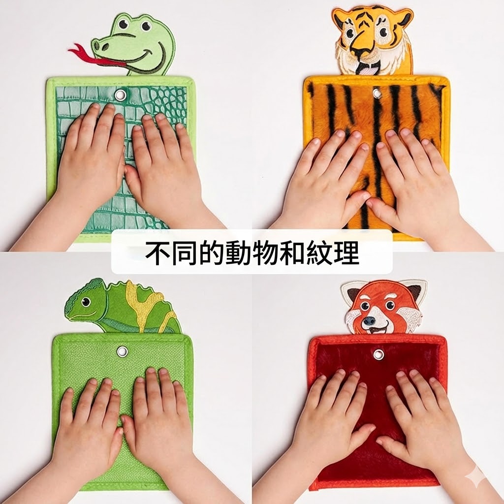 每一片觸覺墊皆採用不同材質設計,模擬毛絨、顆粒、平滑、仿皮等多樣觸感,讓手部感覺更豐富,適合在安靜活動、學習、陪伴時使用。